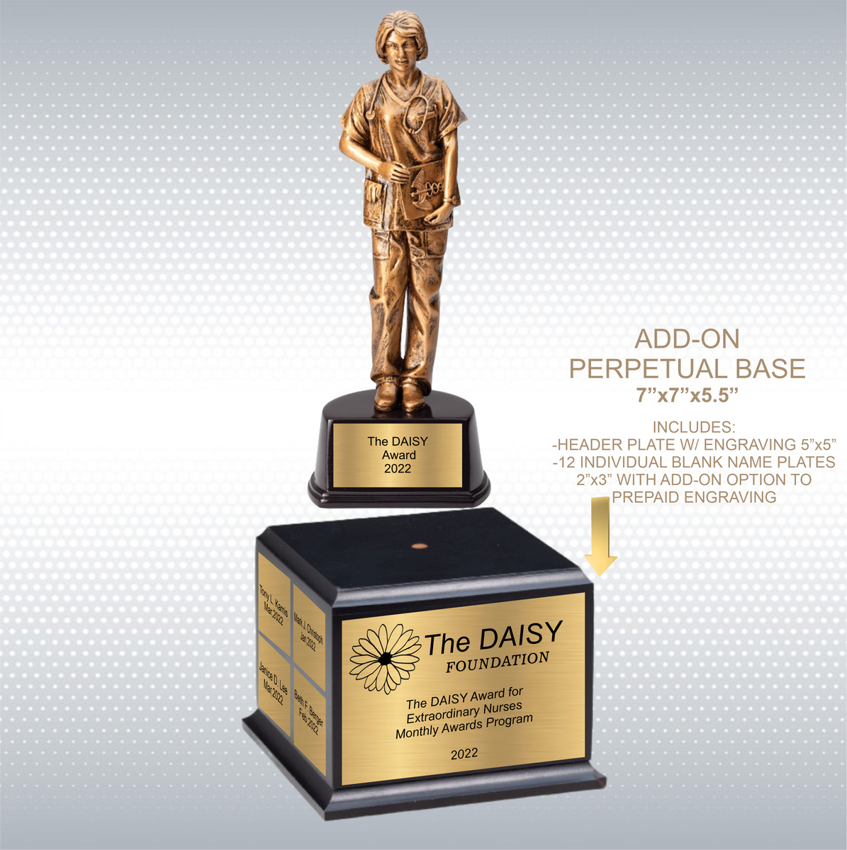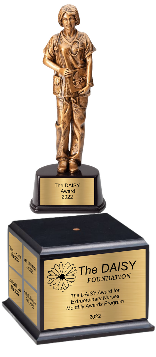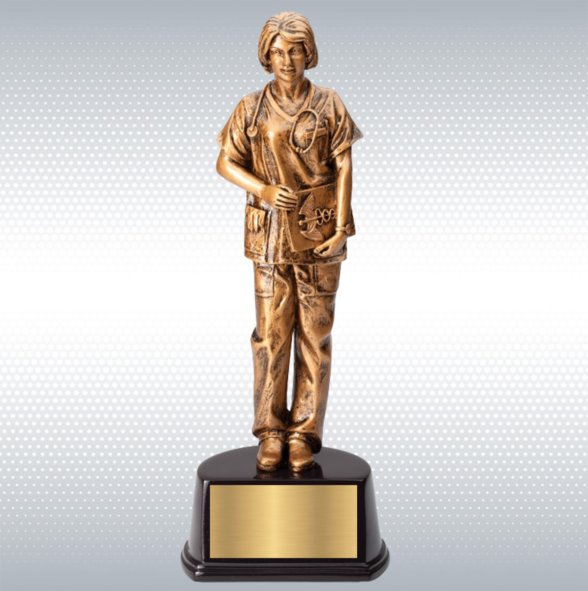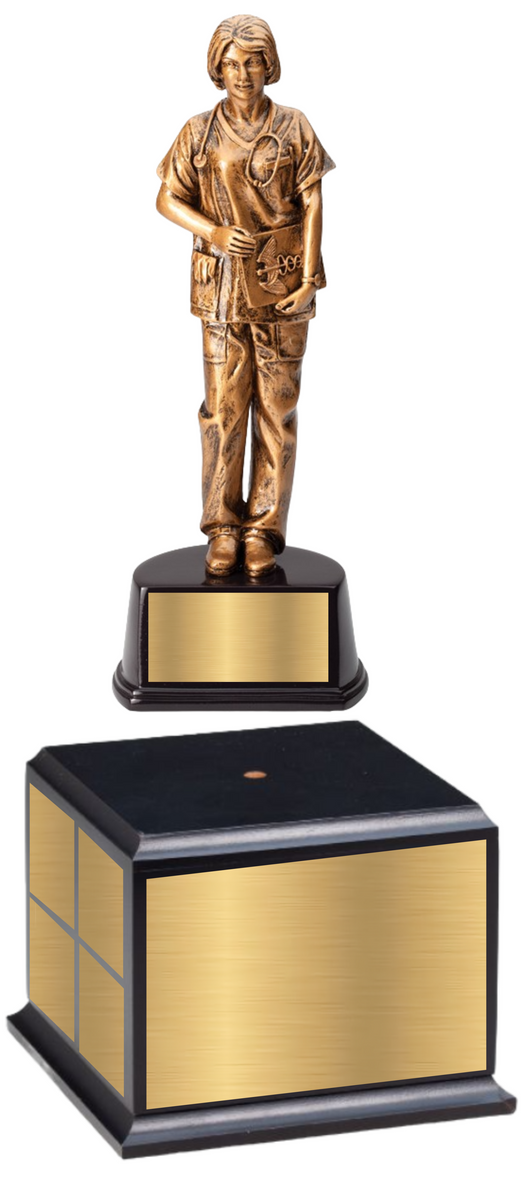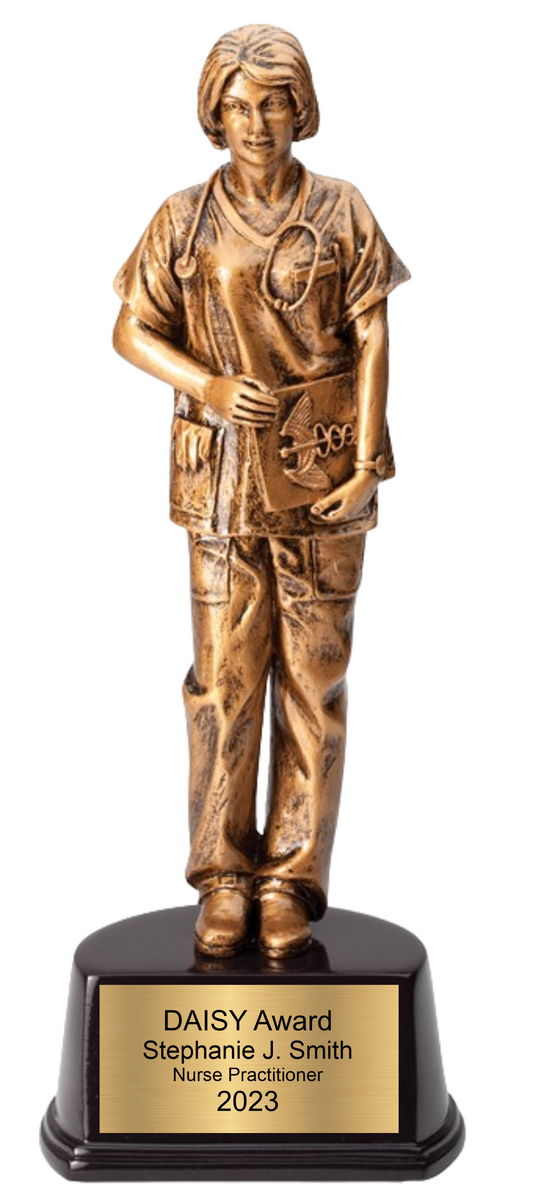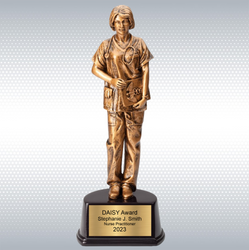 Nurse Sculpture Award in Antique Gold Finish on Black Base is for the nurses who deserves notable recognition-acknowledge one of many who saves lives! Create a presentation that is sure to leave a lasting impression. Add a name, logo, slogan, or image for a truly unique experience. Create piece of art to proudly display in recipient home or office. *NEW* Make this beautiful trophy a perpetual award excellent for annual multi person recognition award programs by choosing to add perpetual base.
